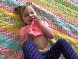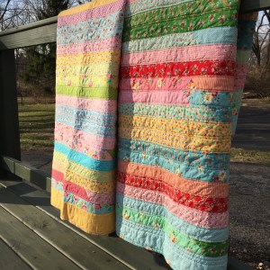 I made them both a larger quilt – not quite twin size – more like an oversize lap quilt. I used the jelly roll race pattern from Missouri Star Quilt Company. These quilts come together pretty quickly because of the precut fabric. Both quilts are from the Bloom and Bliss line from Riley Blake, so they look similar but have different color palates. I call them Twin Quilts for Twins. 😉