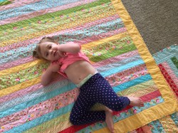 I made them both a larger quilt – not quite twin size – more like an oversize lap quilt. I used the jelly roll race pattern from Missouri Star Quilt Company. These quilts come together pretty quickly because of the precut fabric. Both quilts are from the Bloom and Bliss line from Riley Blake, so they look similar but have different color palates. I call them Twin Quilts for Twins. 😉