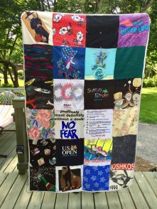 About three years ago T was sorting through her things and came across her parent’s clothes. She decided she wanted to finally do something with them, so when she was back in town she brought over a HUGE tote full of clothes from her parents as well as shirts from her teenage years. It didn’t take me long to get the quilt tops completed. She wanted two double-sided quilts and she preferred them to be quilted. I started but soon realized I wasn’t going to be able to quilt them. There were a variety of fabric types (sweaters, t-shirts, rayon, etc) and with these materials on both sides of the quilt my machine couldn’t pull both sides through at the same rate causing it to look really bad. I tried contacting T explaining the situation and offering some solutions.