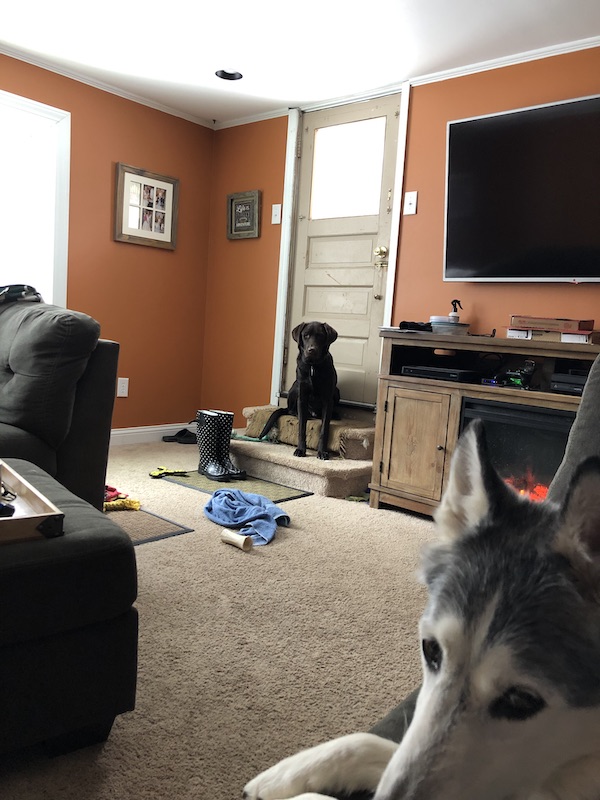 Denali stayed right next to me on the couch last night. She’s back next to me again this morning. Steve, who turned 9 months on Wednesday, is whiny and bored and keeps ringing the bell to go out while I keep saying, “You’re fine.” All is back to normal!