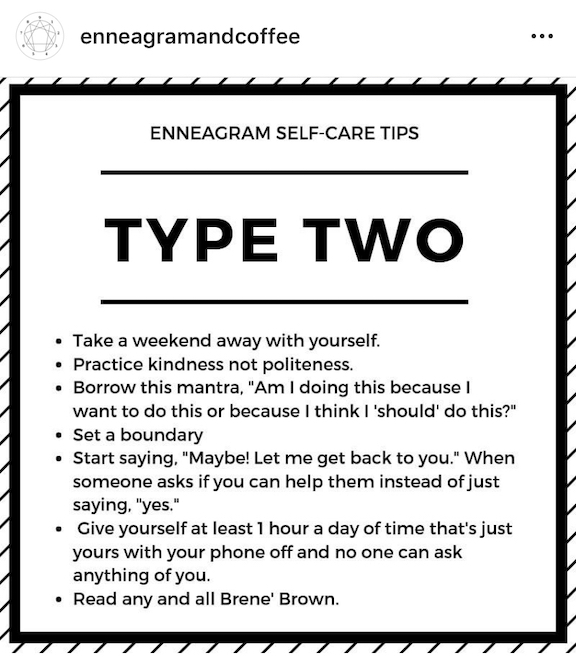 Type 2s “fear that they are without value in themselves, and so they must be or do something extraordinary in order to win love and acceptance from others. In the average to unhealthy Levels, Twos present a false image of being completely generous and unselfish and of not wanting any kind of pay-off for themselves, when in fact, they can have enormous expectations and unacknowledged emotional needs.” (Hint: if you read an Enneagram description and you cringe and want to hide because it’s so true that you can hardly admit it to yourself, then you’ve found your number!) I don’t like this about myself, but it’s true. I find my value in being loved and accepted by others, so I go out of my way to make them love and accept me. And when I don’t get the over-the-top thank you or an acknowledgment of my attempt to get their love and acceptance, I do feel worthless to some degree.